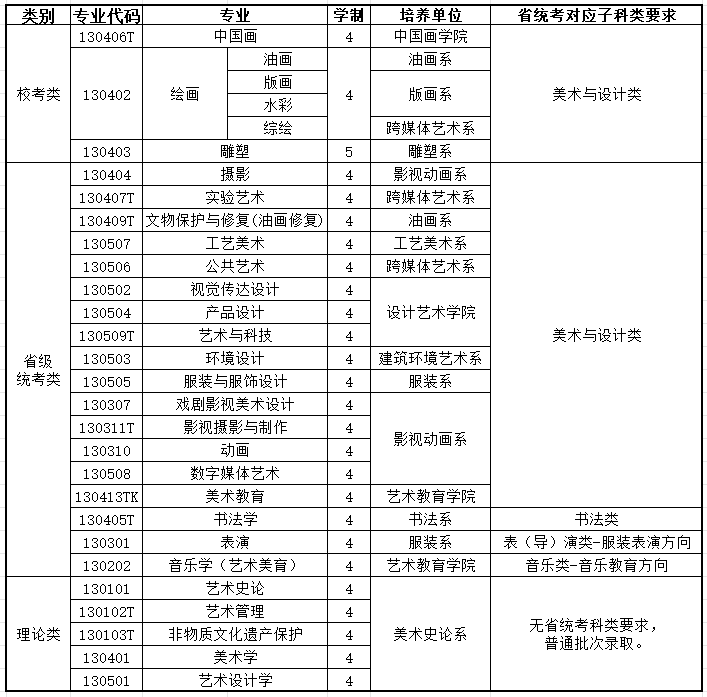 按教育部特殊类型招生工作要求,报考我校艺术类专业的考生须按我校各专业与省级统考科类对应要求参加相应省级统考,各专业对应的省级统考科类要求如下: