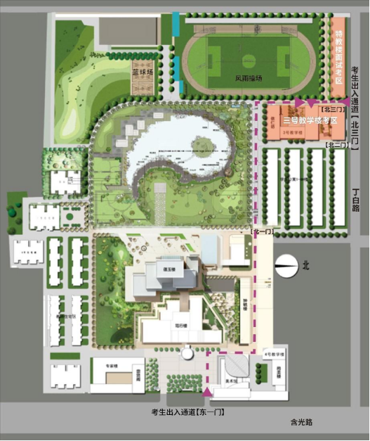 1.考生凭准考证和居民身份证,可由西安美术学院雁塔校区北三门(丁白路)、东一门(含光路)人行通道步行进出 (进校前请自行存放交通工具),按照示意图路线和校园内指引标识进入考区。