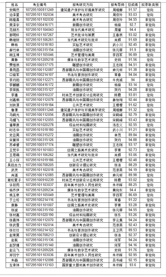 根据《西安美术学院2025年博士学位研究生招生简章》及《西安美术学院2025年博士研究生招生考试工作方案》相关要求,结合我院博士学位研究生招生计划数及考生成绩情况,考虑到录取考生应具备较好的研究能力,较强的综合素质,符合教育部关于研究生招生应遵循的“按需招生、全面衡量、择优录取和宁缺毋滥”基本原则,经学院招生工作领导小组集体研究,制定了2025年博士研究生招生考试拟录取方案,具体如下: