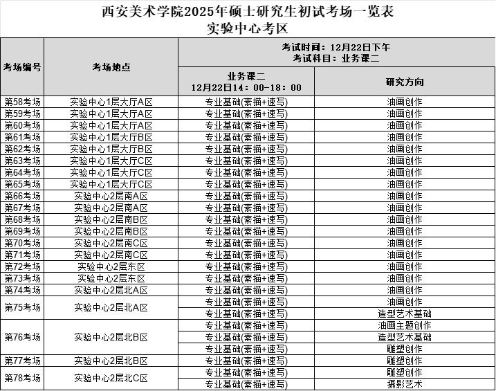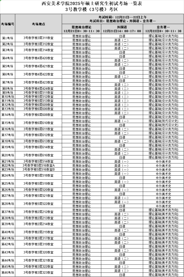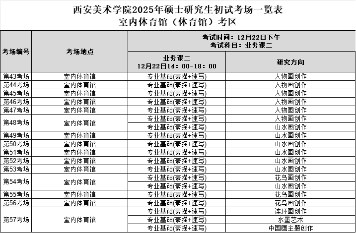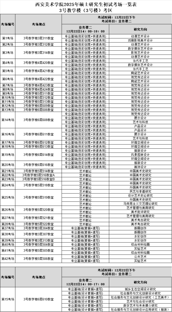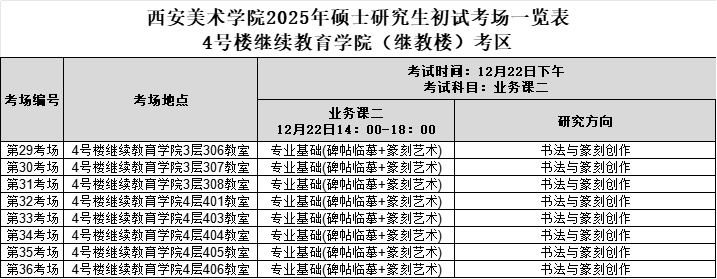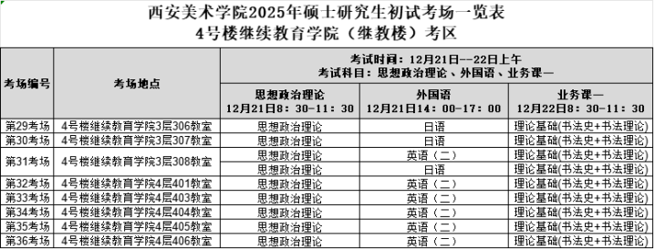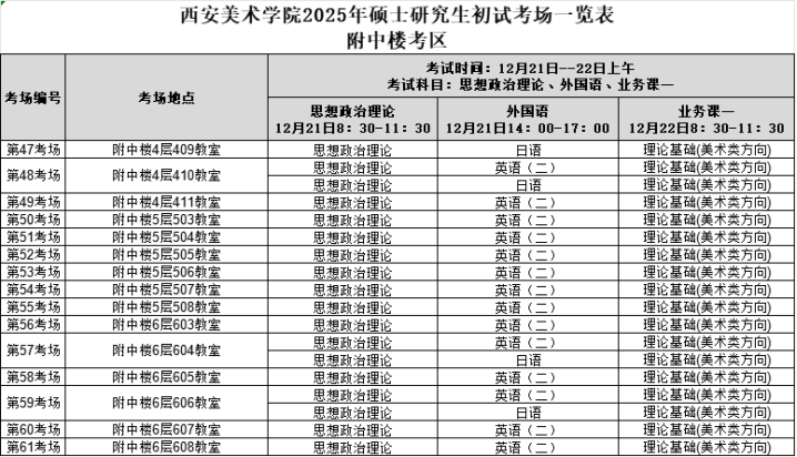 西安美术学院2025年硕士研究生初试考场一览表(报考西安美术学院)